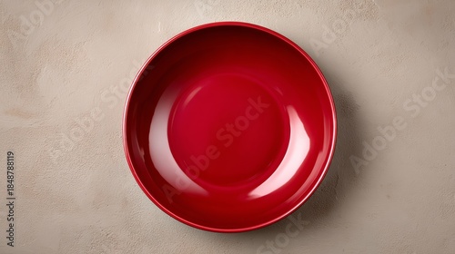 A red bowl sits on a grey surface. The bowl is empty and has a shiny, reflective surface. Concept of emptiness and stillness, as the bowl is not filled with anything