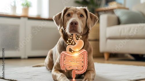 Dog probiotics concept, dog wearing digestive tract illustration highlighting gut health and supplement support for canine digestion.