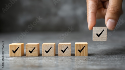 Wooden blocks with checkmarks are arranged in a row, with a hand placing the last block, symbolizing completion and approval.