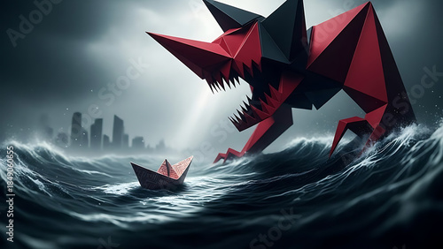 Risk Crisis And Danger concept and business metaphor as a looming threat with a paper boat and origa