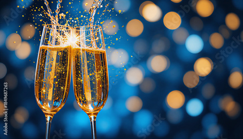 Dwa kieliszki szampana wznoszące toast z rozbryzgiem na niebieskim tle z bokeh i miejscem na tekst, koncepcja świętowania Nowego Roku, sukcesu i luksusu
