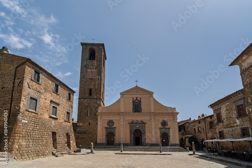Italy - Bagnoregio - Civita di Bagnoregio - Piazza San Donato with church and bell tower framed by stone houses under clear sky, wide perspective