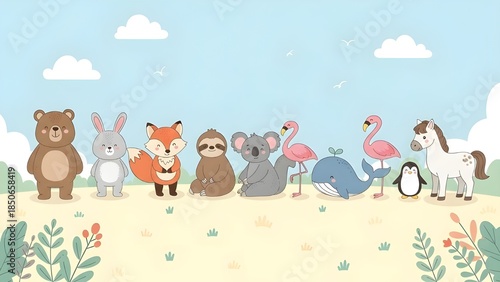 Conjunto de lindo vector animal. Vida salvaje amigable con oso, perezoso, conejo, pingüino, koala, burro en patrón de garabato. Adorable animal divertido y muchos personajes dibujados a mano colecci