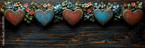 Vintage inspired arrangement of distressed wooden hearts, alternating red and blue, nestled within charming garland of small colorful flowers and leaves on dark rustic wooden background.