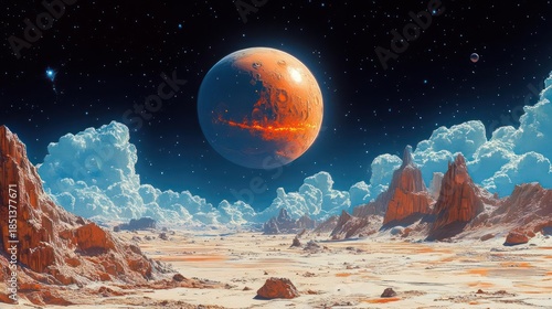 Pixelated Alien Planet Landscape With Giant Orange Moon And Distant Stars Under A Starry Night Sky