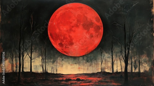 Vibrant Red Full Moon Illuminates Dark Forest Landscape Under Starry Night Sky