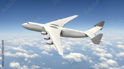 White Airplane Antonov An 225 Mriya the World Largest Cargo Plane with Six Engines Flying Above White Clouds Side View High Angle