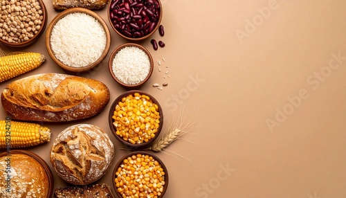 Abundant collection of grain and starchy foods with bread corn rice beans and chickpeas on earth toned background