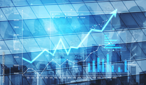 Dynamic business growth visualization featuring financial charts and statistics superimposed on a city skyline, representing innovation and success in corporate environments. Scalp