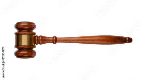 Judges gavel in traditional wooden design with golden band in soft studio lighting on white background for law and justice