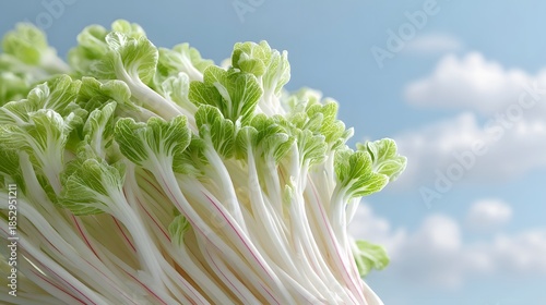 A detailed bright close up view of fresh bok choy s crisp white stalks and delicate green leaves set against a serene blue sky filled with soft white clouds