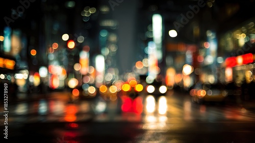 Abstract view of a city street at night with blurred lights reflecting the vibrant urban environment. Blurred background.