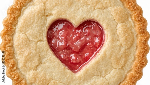Heartshaped strawberry pie closeup with golden crust and fresh fruit filling, symbolizing love and sweet homemade desserts