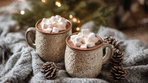 Christmasthemed hot chocolate mugs on a cozy blanket with festive decorations, creating a warm and inviting ambiance.