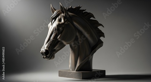 Majestic dark bronze horse head sculpture on a pedestal, featuring transparency as an isolated subject for artistic or equestrian design.