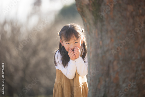 木の陰から顔を出す女の子 かくれんぼやだるまさんころんだなどの昔遊びを公園で遊ぶイメージのクローズアップ