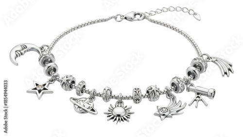 Silver charm bracelet with celestial and astronomical charms on black background jewelry