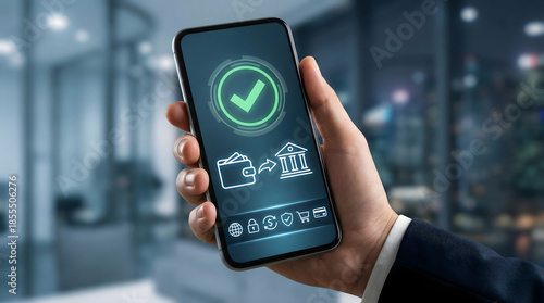 Person,holding,smartphone,showing,successful,mobile,bank,transfer,confirmation,with,digital,wallet,and,banking,icons,representing,secure,and,fast,online,financial,payment,transaction,process
