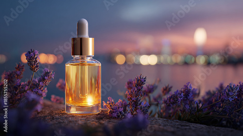 Aromatic serenity: A golden elixir bottle nestled amongst lavender blooms, evoking peaceful nights and natural wellness. A blend of nature and luxurious self-care.