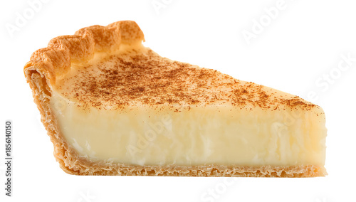 South african milk tart wedge with creamy custard filling, cinnamon top, and crisp pastry shell isolated on white