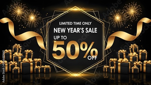New years sale banner with gold decorations and up to fifty percent off discount on a black background with fireworks