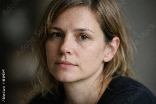 A young Caucasian woman with shoulder-length brown hair and a neutral expression. She is wearing a black shirt and is in a softly lit indoor setting.