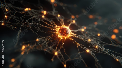 A detailed illustration of a neuron and its intricate network, highlighting the glowing connections within a dark backdrop.