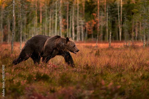 Bear hidden in orange red forest. Autumn trees with bear. Beautiful brown bear walking around lake with fall colours. Dangerous animal in the wood. Wildlife nature from Finland.