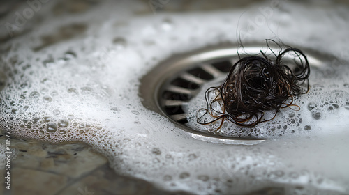 Clogged drain with hair and soap. A common household problem shows a bunch of tangled dark hair near a drain surrounded by white soap bubbles. Close up shot.