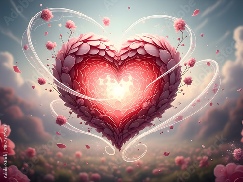Romantic Floral Heart with Glowing Light and Floating Petals