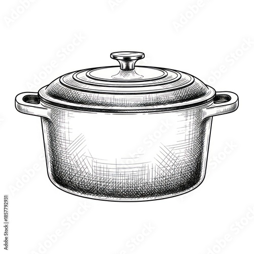 A sketch-style illustration of a classic cast iron dutch oven with handles. This versatile cookware is perfect for various cooking methods.