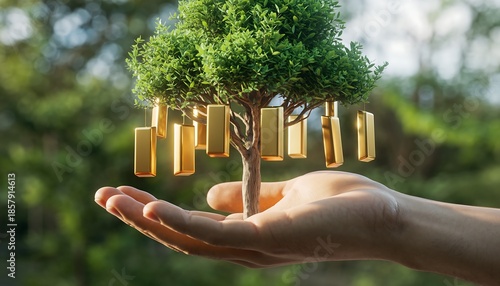 Hand nurturing a tree with gold bars, symbolizing eco-friendly finance and sustainable growth