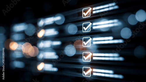 Digitized checklist with glowing check marks, blurred background, representing task completion, progress, and success