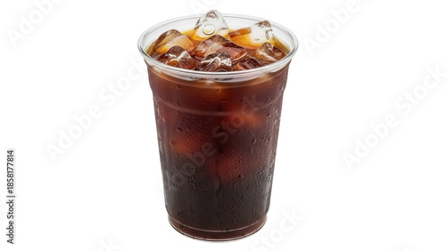 Iced coffee in a plastic cup PNG isolated on transparent background, refreshing cold brew drink with ice cubes for summer