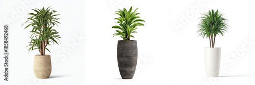 Three elegant plant pots with tall green plants are displayed against white background, showcasing different pot designs and textures. plants add fresh and natural touch