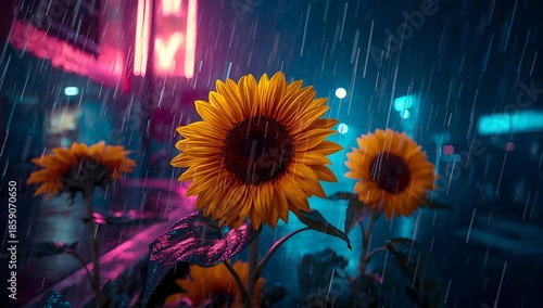 Vibrant sunflowers bloom in the rain on a city street at night with neon lights reflecting off wet pavement