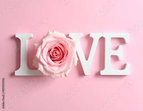 Miłość. Białe duże drukowane litery tworzące napis LOVE na różowym tle. Duża litera O w postaci róży. Kartka Walentynkowa.