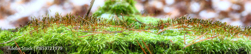 Panoramic Macro of a Lush Green Moss Colony with Reddish Sporophytes