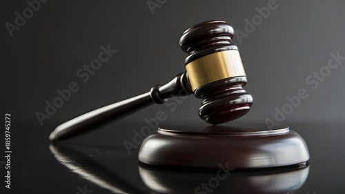Wooden gavel and sound block on a dark reflective surface.