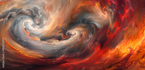 Abstrakcyjny wir ognia i dymu w czerwieniach oraz pomarańczu, dynamiczna burza energii, dramatyczne tło pełne ruchu.