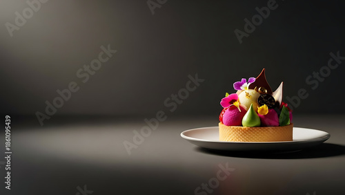 An elegant dessert tart with colorful fruits and delicate flowers is presented on a white plate.