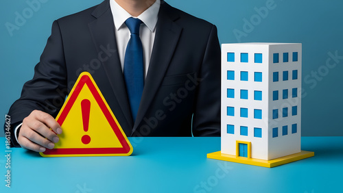 Property Risk Front View Conceptual Symbolism, Businessperson with Warning Sign and Building Model, Real Estate Hazard and Safety Metaphor, Light Blue Background