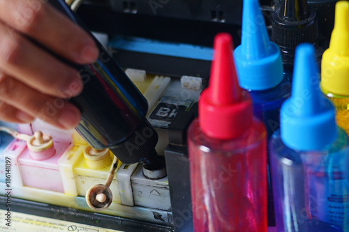 Hand holding ink bottle. Refill ink tank for ink jet Printer