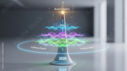 Futuristic marketing strategy with data, ads, and content for brand visibility