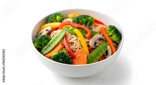 Bowl of healthy vegetable stir fry noodles isolated on white background