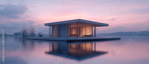 Minimalist floating pavilion with warm interior glow at sunrise, modern architecture on calm reflective water