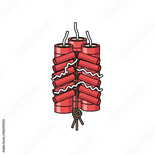A cartoon illustration of red firecrackers, tightly bound together with a fuse