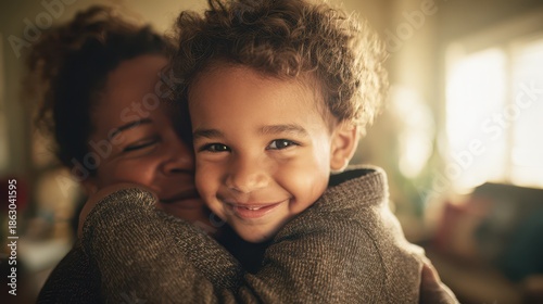 Cozy living room embrace between an African American mother and her Hispanic son, natural light