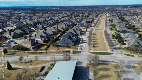 Winter streetscape in Prosper, Texas featuring long tree lined median, uniform homes, and festive community area with seasonal decor, showcasing organized suburban planning, neighborhood symmetry