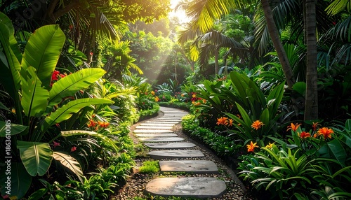 Enchanting Tropical Garden Pathway Bathed in Golden Sunlight.